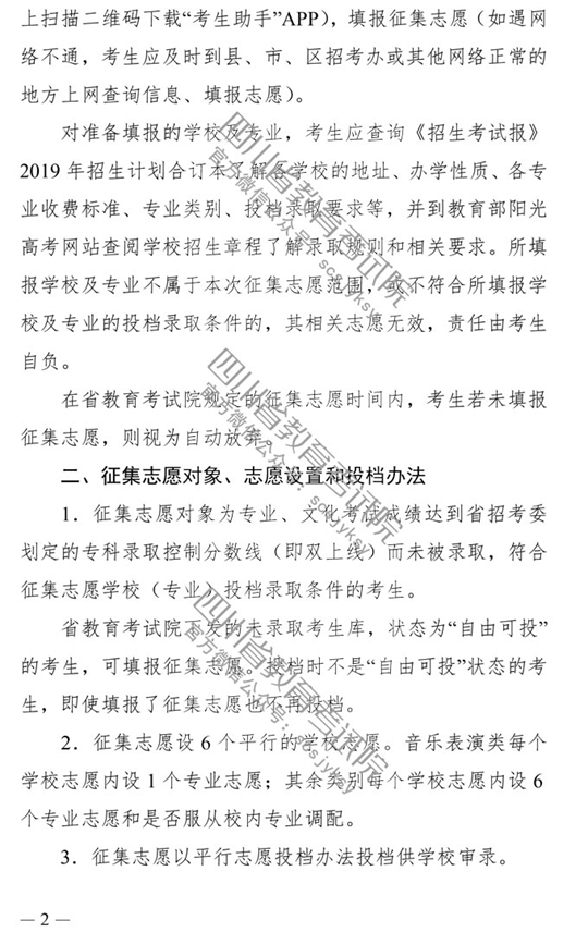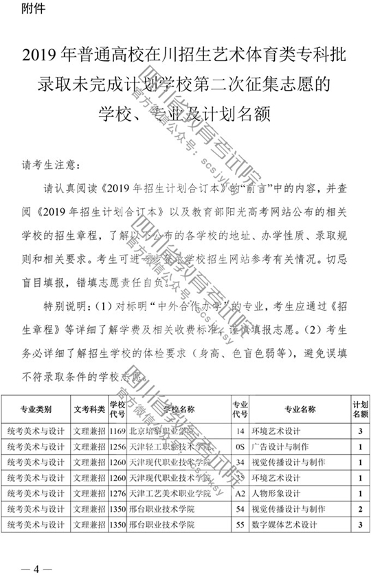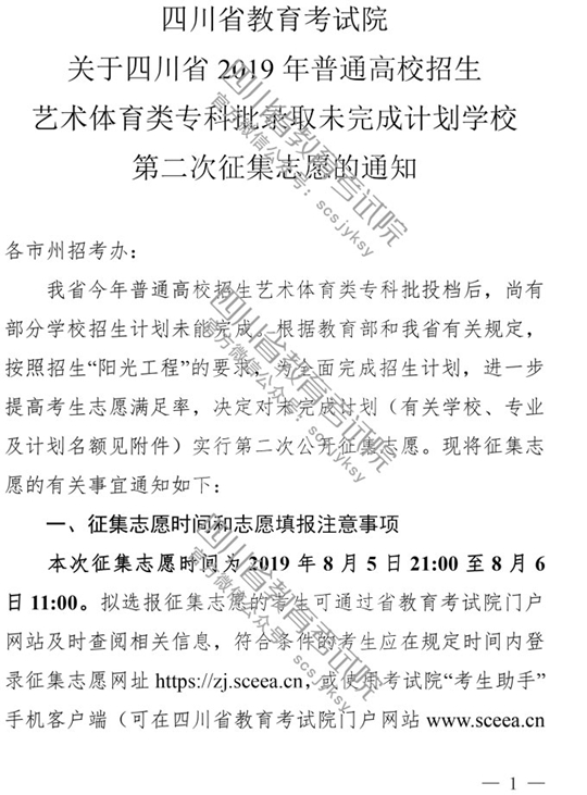 四川:2019年普通高校招生艺术体育类专科批录取未完成计划学校第二次征集志愿的通知
