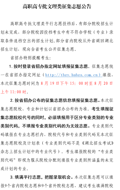 湖北:高职高专批文理类征集志愿8月20日截止