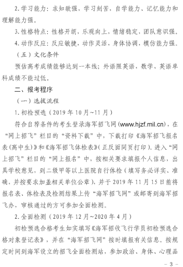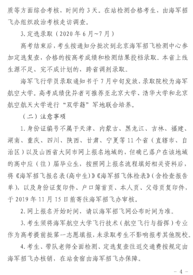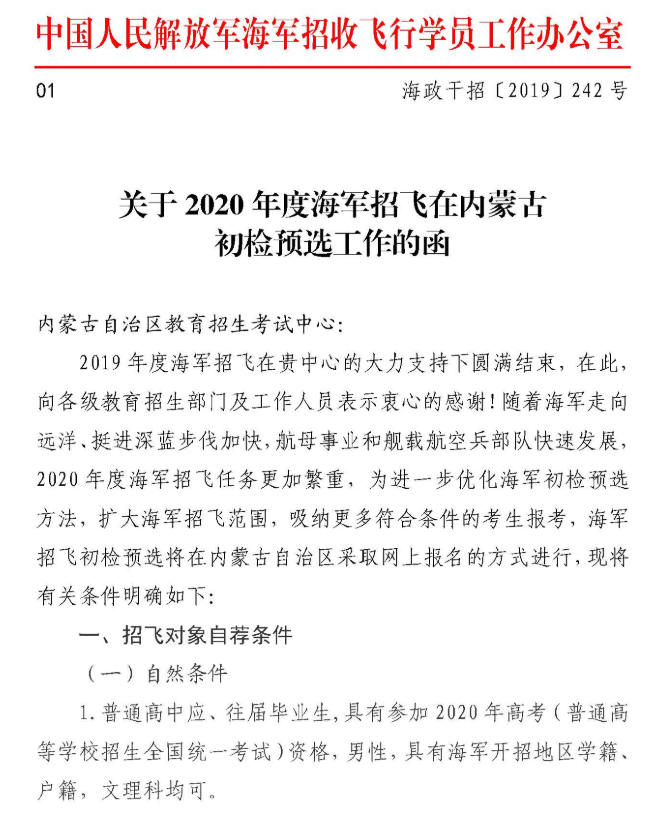内蒙古:2020年度内蒙古自治区海军招飞初检预选函