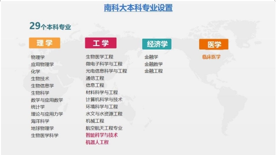 南方科技大学是一所高起点、高定位的公立创新型大学,以理工类、医学类为主。近年来,学校发展迅速,在国内外多项权威排名中成绩突出,已初步建成国际高水平研究型大学。2019年,新设立智能科技与机器人工程专业。