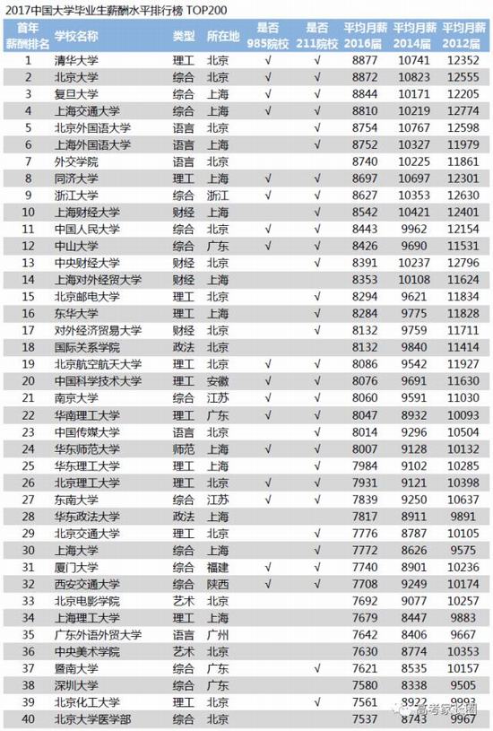 不知大家在选择学校和专业时,有没有仔细考虑过未来的就业前景,薪资水平。今天小编整理了2017年中国大学毕业生薪酬水平排名前200的院校,一起来看看你的大学上榜了吗? 从上面的大学毕业生薪酬排行榜可以看出,近几年清华北大毕业生始终占据高位!大多数高薪酬毕业生均来自985、211院校。但也有例外,比如外交学院,14年毕业生的月薪已超过复旦大学,看来外交官是经验越丰富的越“吃香”!