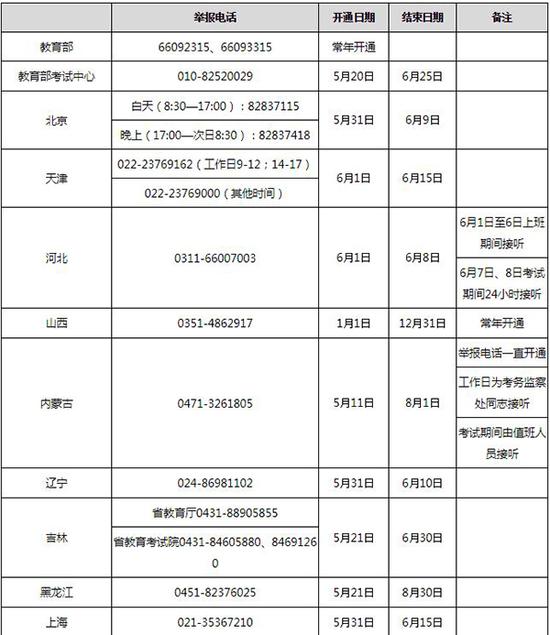 其中,教育部的举报电话常年开通,教育部考试中心举报电话5月20日开通后,6月25日结束,而北京举报电话开通周期为5月31日至6月9日,早晚24小时值班。