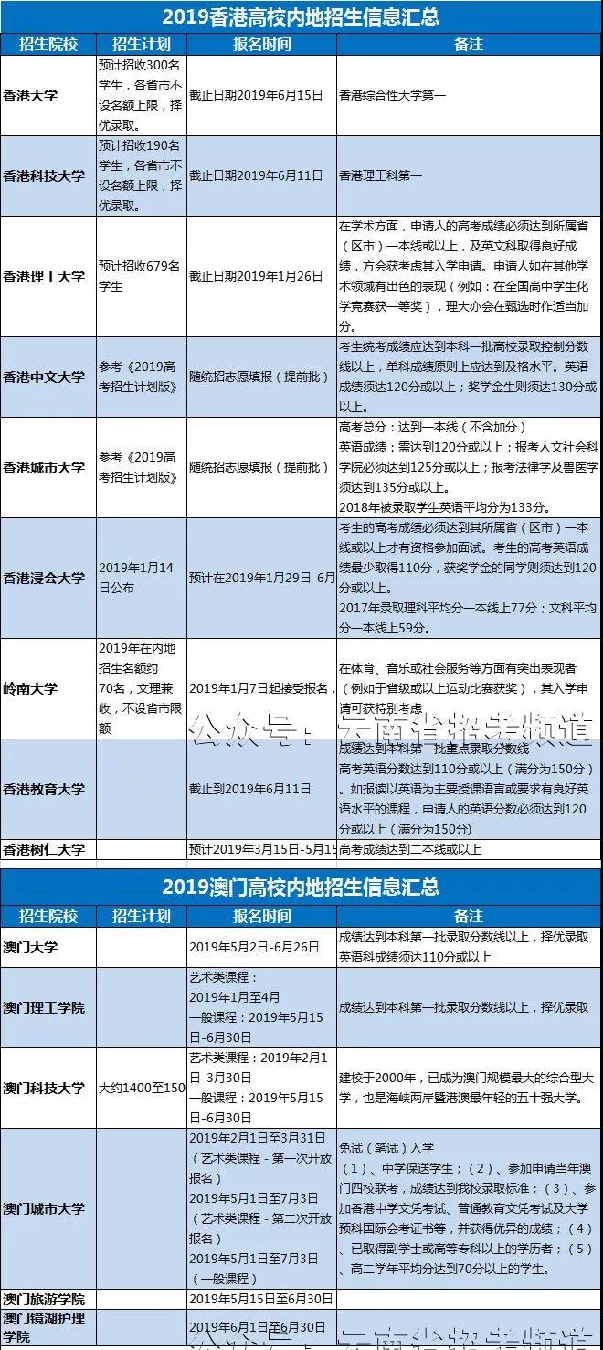 2019年香港、澳门高校内地招生陆续进行。如香港大学预计在内地招收300人,已开始接受报名;香港中文大学将于1月在福建、山西、湖南、广东等省份举办招生说明会。详细信息请查看2019年港澳高校报考指南。有意向报考港澳高校的考生及家长可注意高校内地招生宣讲活动,以及报名时间。