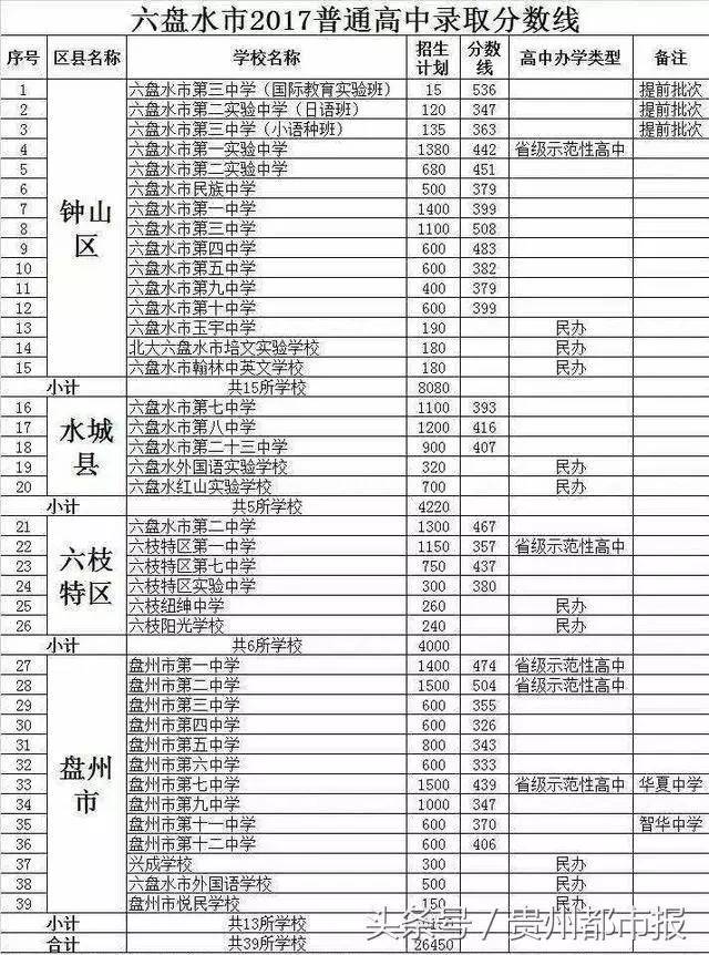 市一中399分、市二中467分、市三中508分、市四中483分、市七中393分、市八中416分、市十中399分、市民中379分、市实验一中442分、市实验二中451分、六枝一中357分、盘州市一中474分、盘州市二中504分、市九中379分、市五中382分。
