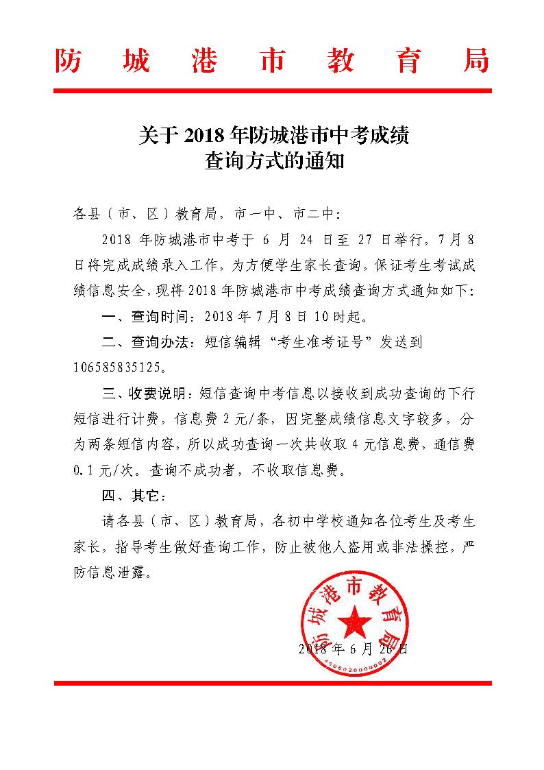 2018年广西壮族自治区防城港市中考查分时间:7月8日