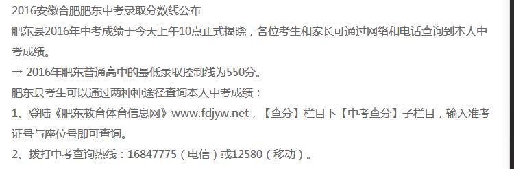 安徽省合肥市肥东县2016年肥东凯越中学中考录取分数线:550分
