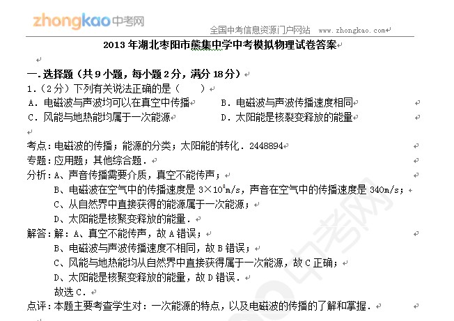 2013年湖北枣阳市熊集中学中考模拟物理试卷答案