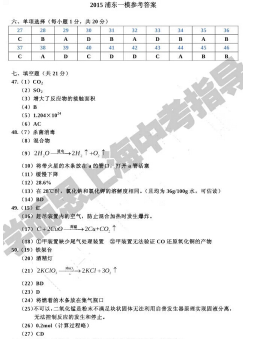 2015浦东区一模化学真题答案解析