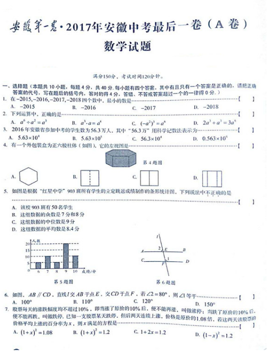 2017年安徽省中考数学科目即将开考,中考网为各位考生整理了考前最后一套压轴题试卷,希望对各位学子和家长们有所帮助,预祝大家考试取得好成绩。下面是《2017年安徽省中考数学压轴题》,供大家参考。