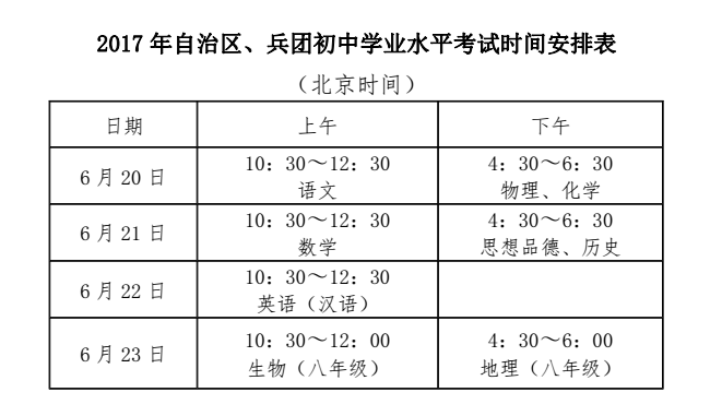 2017年新疆石河子中考考试时间及科目安排公布