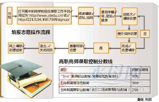填报志愿时间从今天开始直至11日,期间每天8:30-17:00。网址同成绩查询一致,http://www.yt-edu.cn/或http://221.0.94.168:7001/signup/。