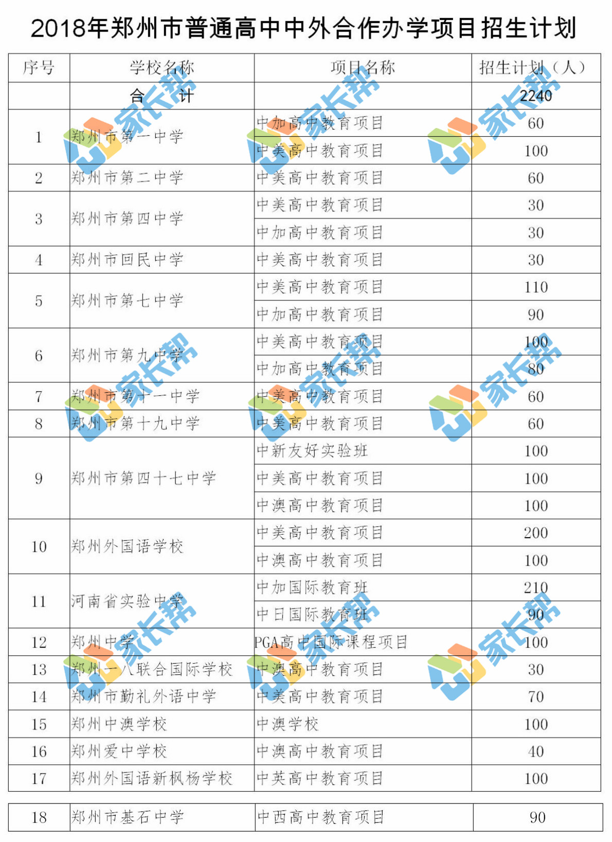 2018年郑州市普通高中中外合作办学项目招生计划(国际班)