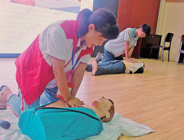快来人啊,这儿有人晕倒了,赶快拨打120电话。吴金花以讲台旁边放着的人体模型做示范,继续上这堂别开生面的急救演练课。手臂伸直,双手交叠,垂直按压同学们走上讲台,跟随吴金花的动作,认真学习心肺复苏术以及校园内常见意外伤害的急救处置方法。真没想到,我升入高中的第一堂课是学习急救知识,今天才知道用了多年的小常识是错误的。课程结束后,同学们难掩内心的激动,纷纷述说此次课程带来的收获和快乐。