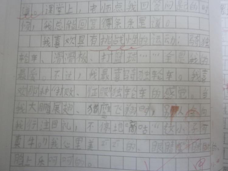 我喜欢具有挑战性的运动:骑独轮车、滑滑板、打篮球都是我的最爱。不过,我最喜欢的是骑独轮车。我喜欢那种打败、征服独轮车的感觉。当我大鹏展翅、猎鹰飞翔时,别人都向我行注目礼,不停地嘀咕:这小子可真牛。我心里美滋滋的、眼睛笑眯眯的、脸上乐呵呵的。